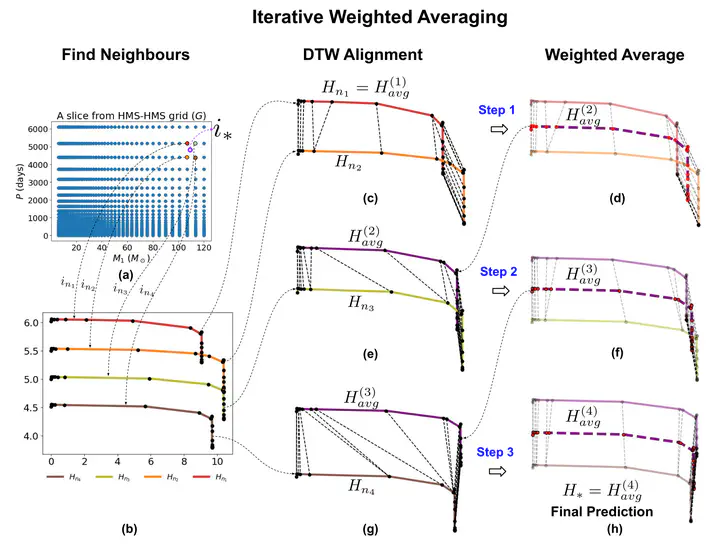 Shared warping path alignment for binary stellar tracks using DTW.Binary stellar evolution simulations are computationally expensive, yet they are fundamental to stellar population synthesis. While single-star track interpolation is straightforward, the interactions in binary systems—such as mass transfer and tidal forces—introduce discontinuities that make traditional methods inapplicable. In this work, we introduce a novel approach for track alignment and iterative track averaging based on Dynamic Time Warping (DTW). Our method computes a single shared warping path across all physical parameters simultaneously, placing them on a consistent temporal grid that preserves causal relationships. We demonstrate that this joint-alignment strategy maintains key physical laws, such as the Stefan-Boltzmann law, in the interpolated tracks, consistently outperforming standard interpolation methods across multiple binary configurations.